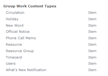 If you then activate the site feature Group Work Lists, you will see 3 more lists, and a load more content types