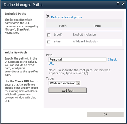 We are almost finished, run a quick IIS reset and try to create a mysite, you might get the error below, as the managed path personal is the location used to navigate to mysites, but you can change it to anything you want.