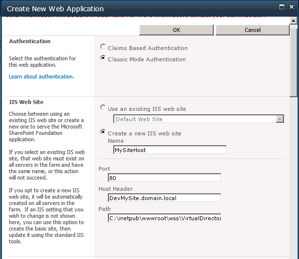 The first step is to create a new Web Application with the appropriate value in the Host Header field