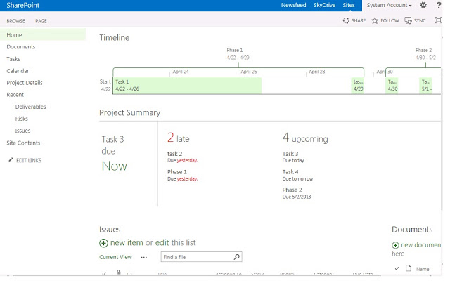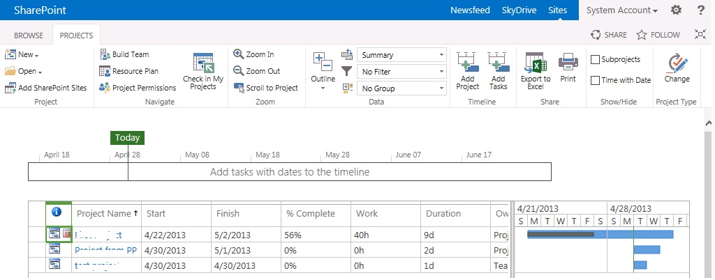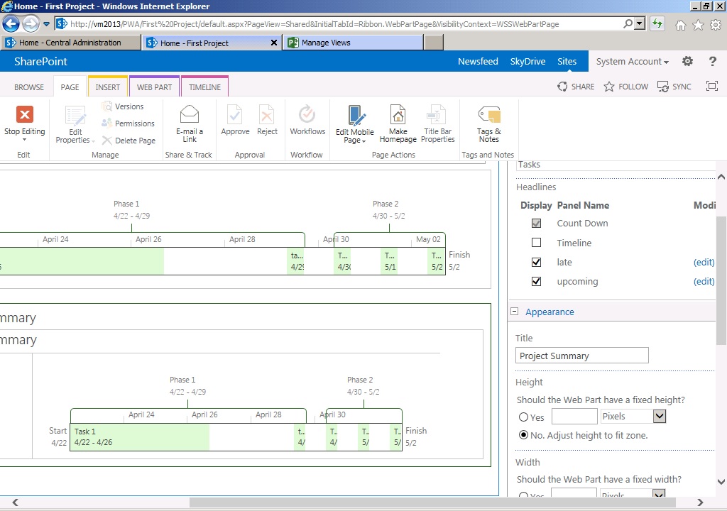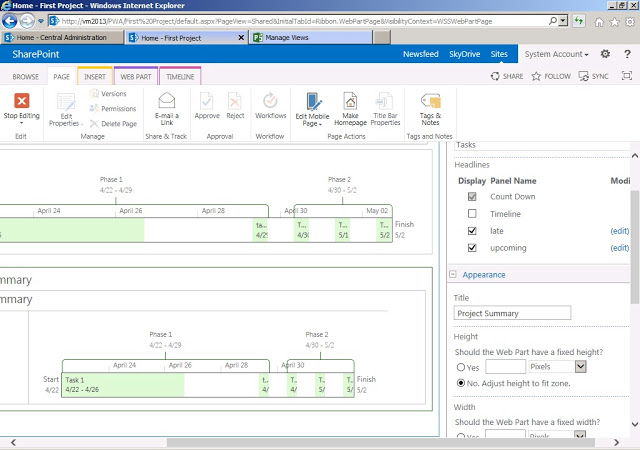 Before we wind up, a quick hint to show that you can also add a famous Timeline web-part to your project site home page to show timeline alone. And also you can modify the existing Project Summary web-part to reflect information minus timeline.