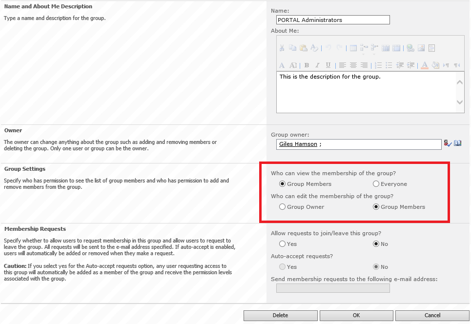 - Go to the group “Portal Administrators” in this case (Site Actions (or Cog in SP2013) > Site Settings > Site Permissions)