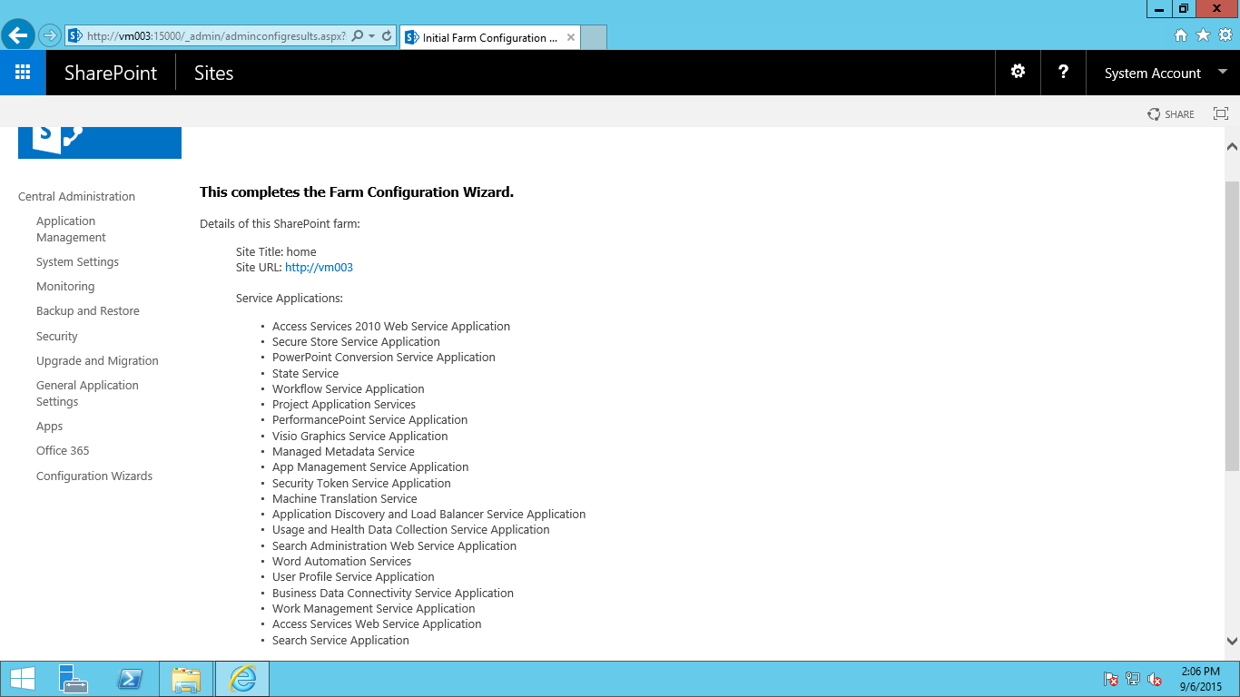 Where we left yesterday was letting the configuration wizard run (usually a big no no for people, but you have to try these things now and again… I know it leaves your configuration databases with GUID’s etc… but for the sake of this testing period, I’m OK with it.)