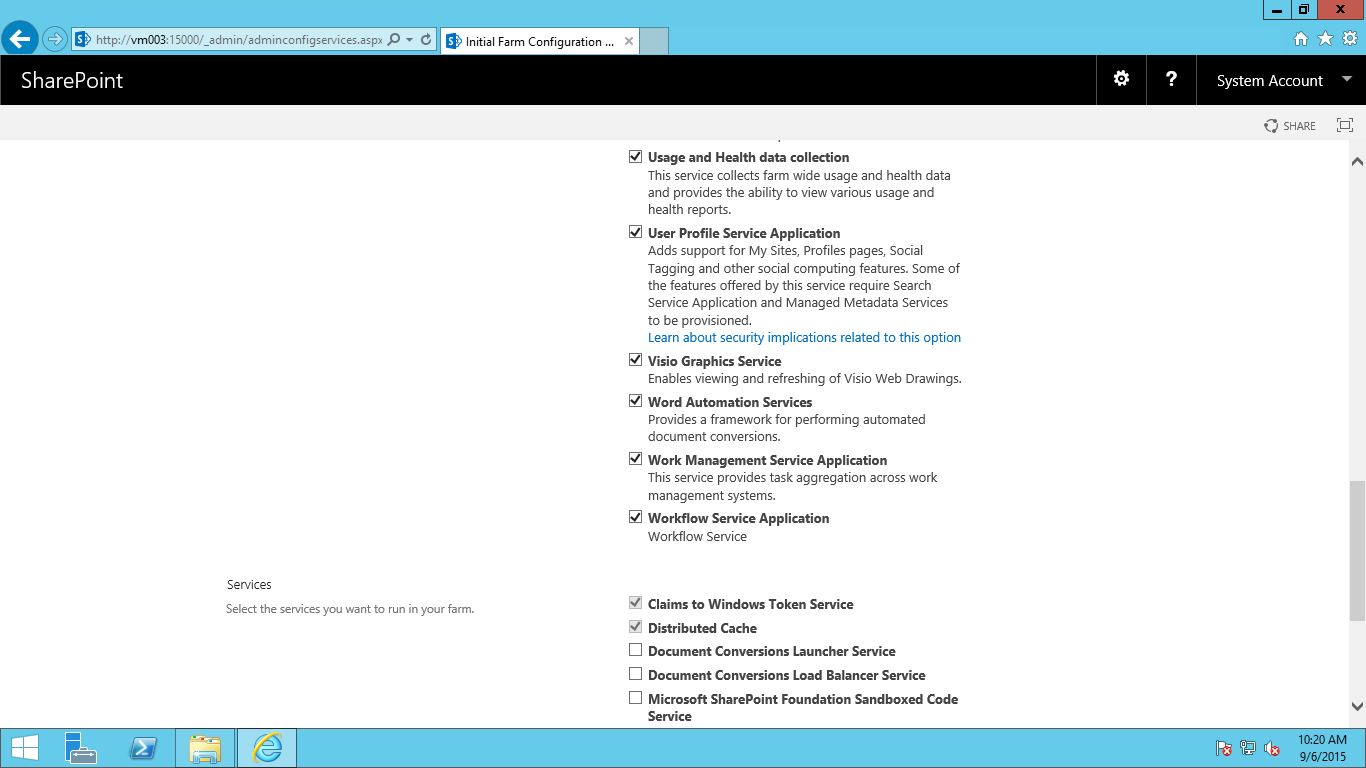 So to start with, we choose the services. I am keen to know how well the default runs so I am leaving the check boxes as they are.