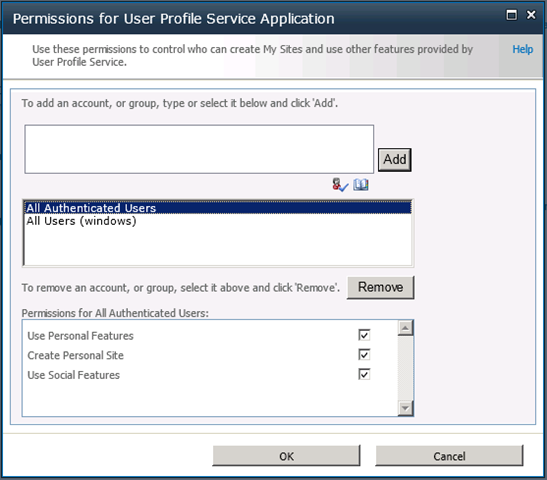 To Remove the My Site and My Profile links go to CA –> Manage service Applications –> User Profile Service Application –> Manage User Permissions