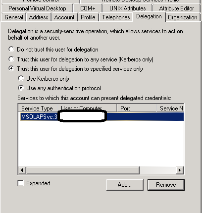 Use the Add… button to find the service account for the SSAS Domain account mentioned above and select the Service Type you setup earlier.