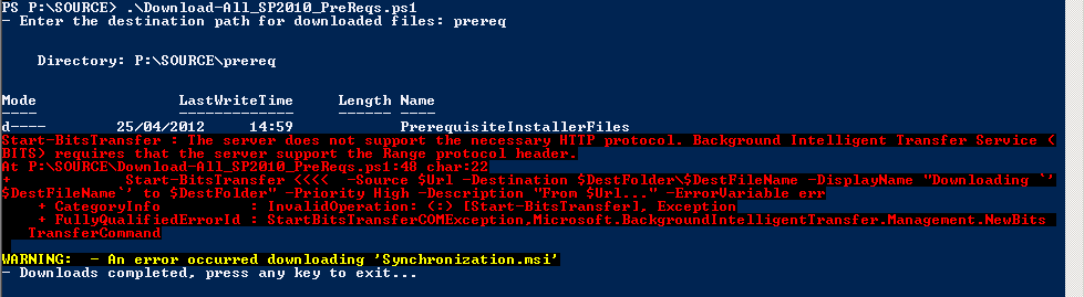 One of the projects I’m currently working on is a 2010 Farm build, we are just getting the media set ready to install SharePoint with AutoSPInstaller, and of course need to download the Pre-Requisite Installer Files. For this particular project I have no local access to the servers so everything is being done by RDP on the server. So to download the Pre-Requisite Installer Files I’m was using this script from codeplex, but it was failing with a really wierd error