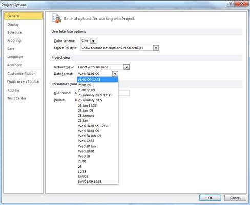 Open Microsoft Project and click on File > Options. Under the General tab, change the Date format to include the time, as below, and then click OK.