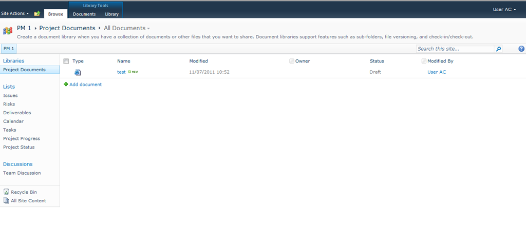 A bit on the background information to start with so that it makes it clear later on in the post why you see these errors. Project Server has its own permission model that works differently to the SharePoint permission model. Users are added to Project Server via the PWA > Server Settings > Manage Users interface and not the SharePoint Site Actions > Site Permissions interface. This is because users will be added to the PWA site based on their Project Server permissions, to an extent the same can be said for the Project Sites. Although Project Sites appear and function the same as a normal SharePoint site, certain lists / document libraries work very differently to standard SharePoint lists / libraries. The Project Documents library, Risks list and Issues list link back to Project Server so therefore when editing / adding items, firstly the SharePoint permissions will be checked, then the Project Server permissions will be checked. If the user doesn’t have the correct permissions in Project Server, then they will see errors, even if they have full control on the Project Site. Each error is shown below.