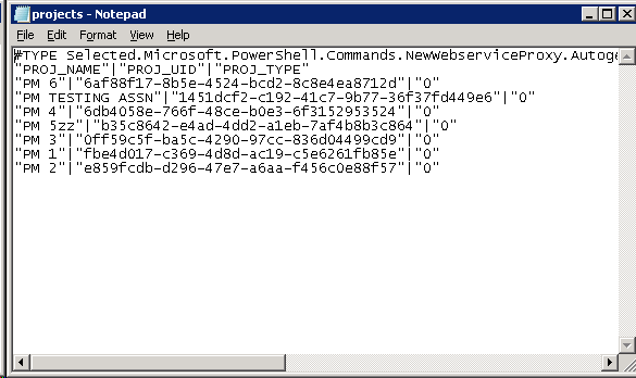 This script will export out a list of Project names, Proj UIDs and the Project Types to the C drive in a text file called projects.txt using the pipe delimiter. Screen shots below show the script and the output.