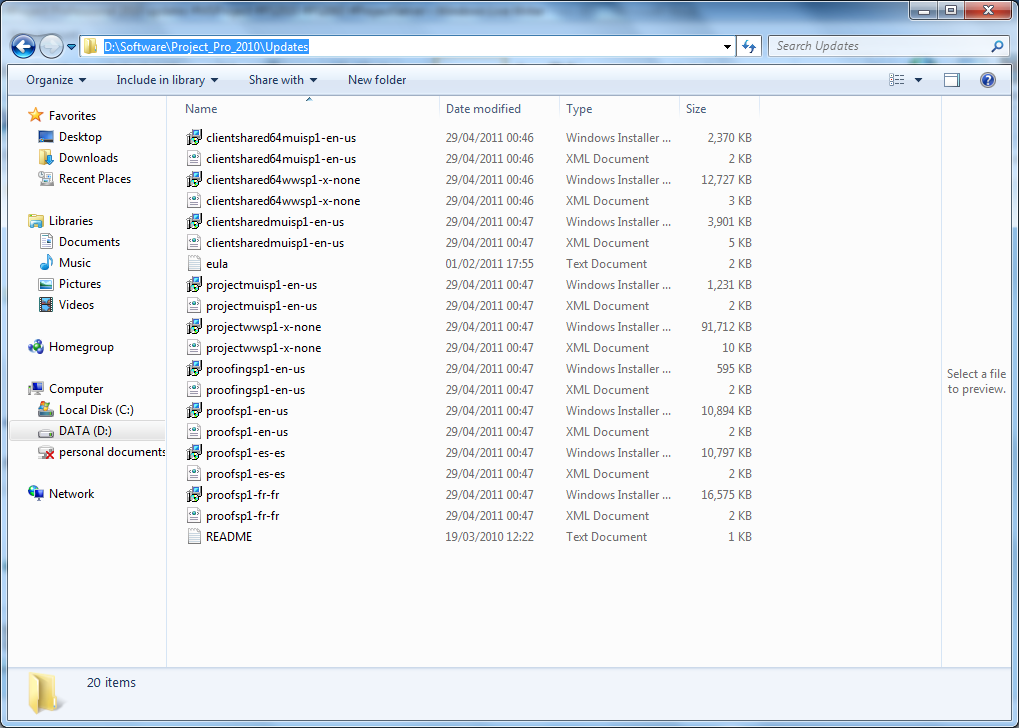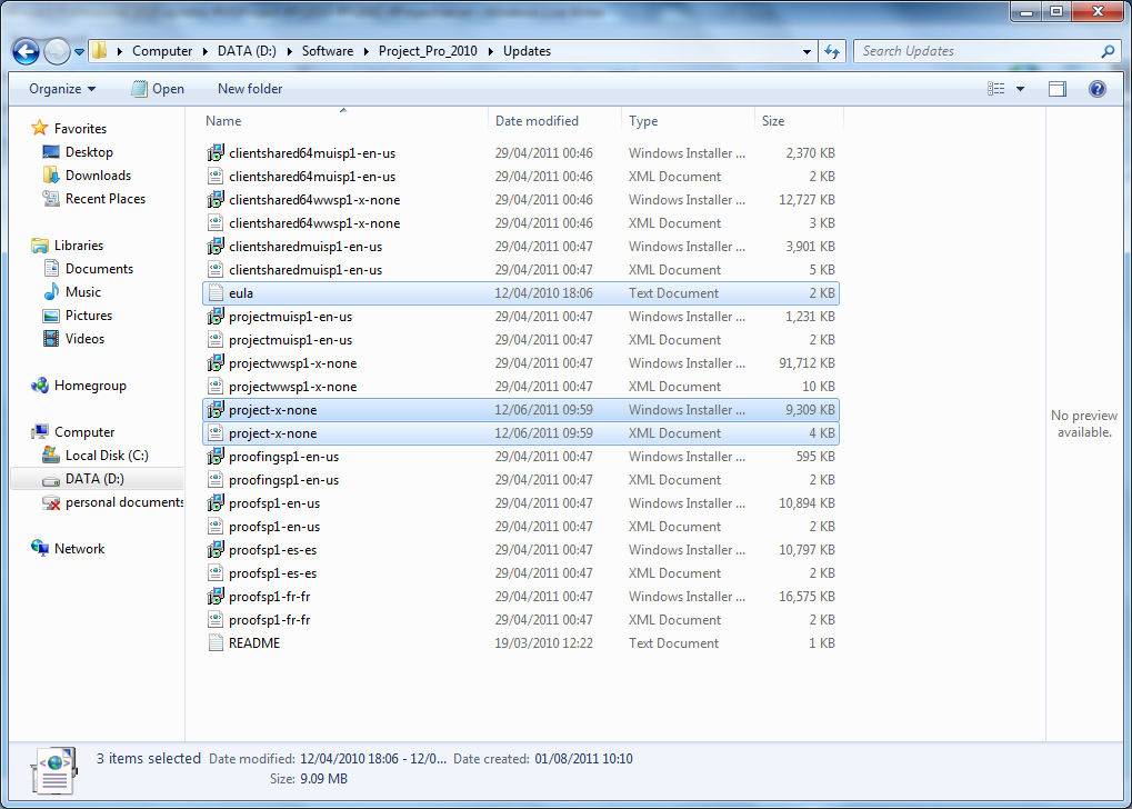 Following on from my previous post Customising the Project Professional install, this post looks at slipstreaming the Project Professional 2010 updates into the Project install media. This simplifies the install as there is just one install file to run. This post will look at slipstreaming Service Pack 1 and the June 2011 Cumulative update into the Project 2010 install media. The same process applies for Project Professional 2007 but use the 2007 updates. This process also applies for other Microsoft Office applications with the relevant updates.